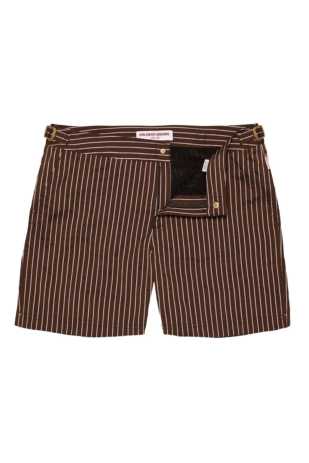 DETAILS AND INSIGHT Orlebar Brown bulldog classic stripe short in copper/white sand. 100% polyester Gentle wash Made in Portugal Style 280083-COP/WHT/SND