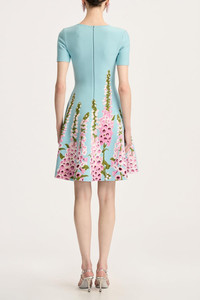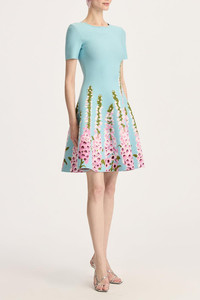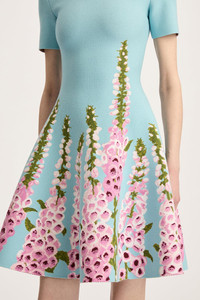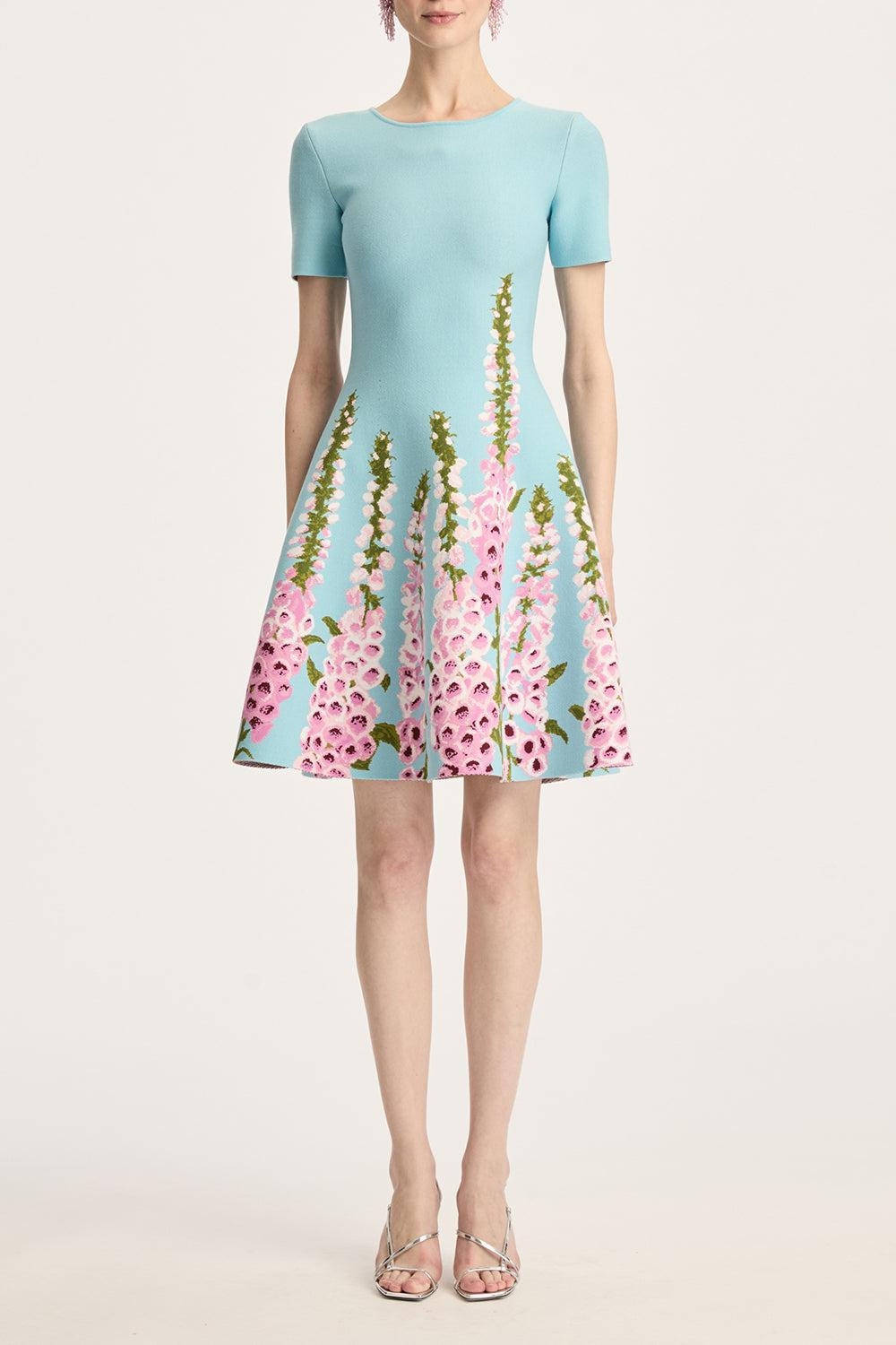 DETAILS AND INSIGHT Oscar De La Renta allium jacquard fit & flare knit dress in lilac / sky. 72% Viscose (Vi) 25% Polyester (Pl) 2% Polyamide (Pa) 1% Elastane (Ea) Dry Clean Made In Italy Style 26RN112PSJ-LLS