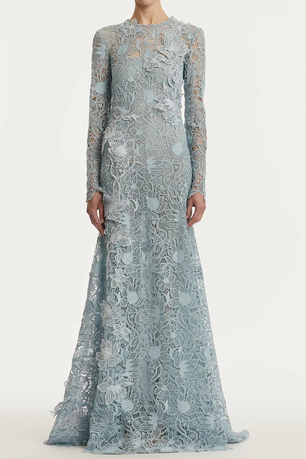 DETAILS AND INSIGHT Oscar De La Renta corded botanical guipure gown in sky blue. 100% Pl, Lining: 100% Silk Dry Clean Made In Usa Style 25FE018PEU-BLUE