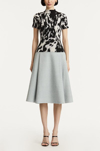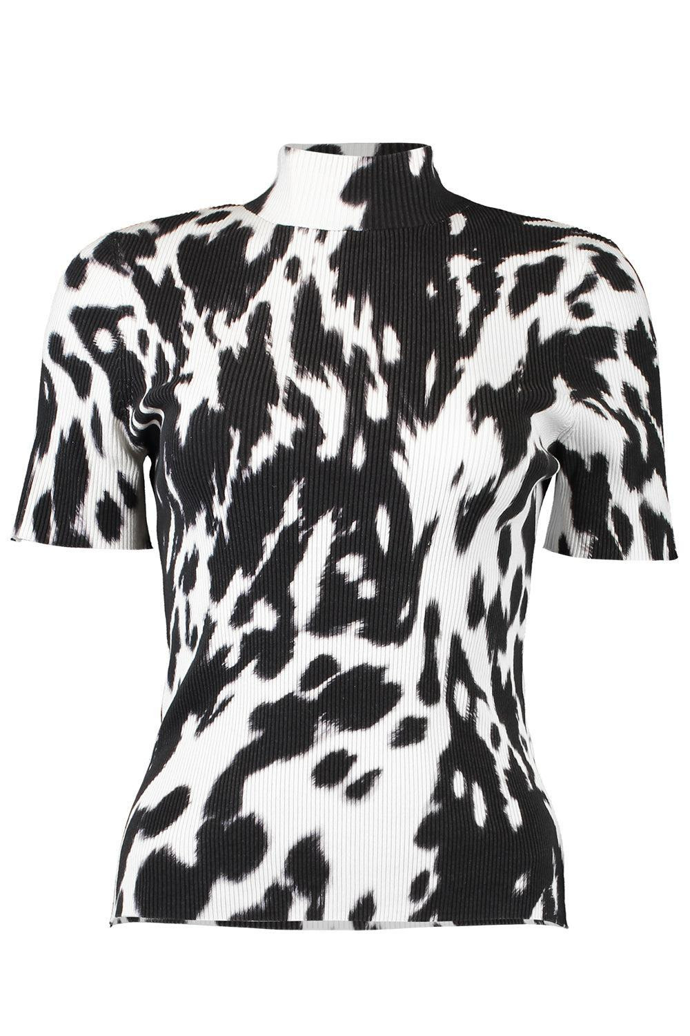 DETAILS AND INSIGHT Oscar De La Renta cow print classic mockneck short sleeve tee in black / ecru. 100% Wv Dry Clean Made In Italy Ships By Oct. 7 Style 25FN102CRB-EBK