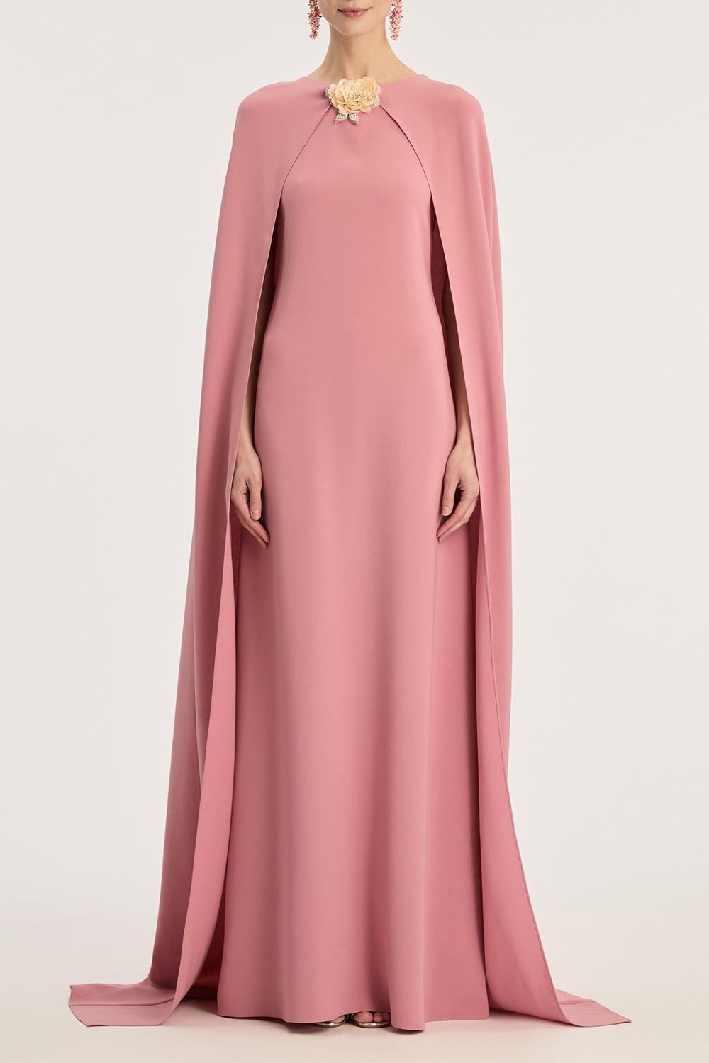 DETAILS AND INSIGHT Oscar De La Renta draped sleeve brooch caftan gown in antique rose. Polyester Dry Clean Made In Italy Style 26RN915HSG-ANR