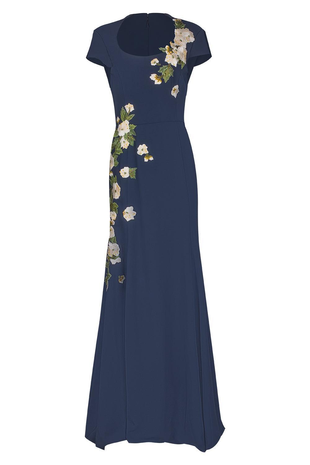 DETAILS AND INSIGHT Oscar De La Renta embroidered cherry blossom gown in navy. Lining: 94%Silk 6%Ea Self: 97% Vi 3% Ea Dry Clean Made In Usa Ships By Aug 8 Style 25PE009SRY-NAV