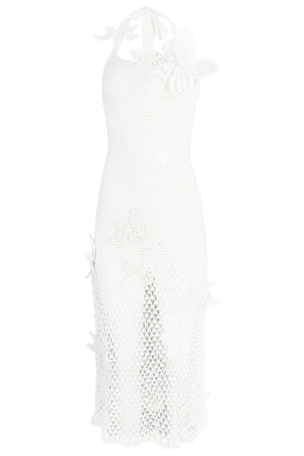 DETAILS AND INSIGHT Oscar de la Renta halter orchid embroidered dress in ivory. 100% cotton Dry clean Made in USA Style 25RN199ORH-IVR