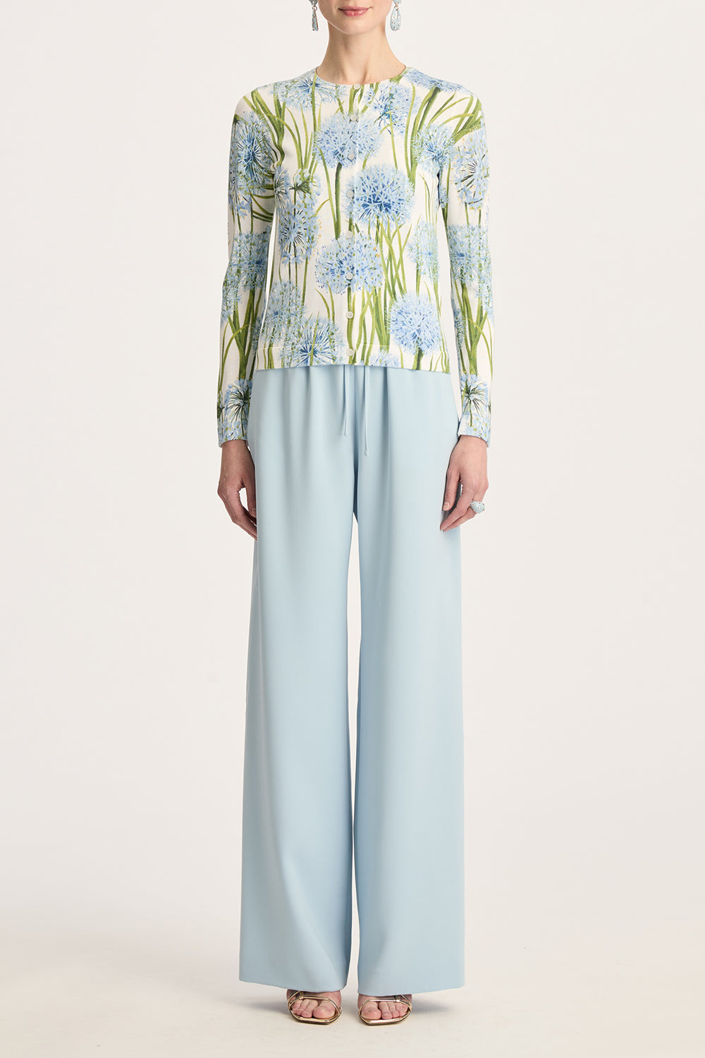 DETAILS AND INSIGHT Oscar De La Renta long sleeve printed allium cardigan in bwe. 57% Cotton (Co) 43% Viscose (Vi) Dry Clean Made In Italy Ships by Feb 7 Style 26RN125BPT-BWE