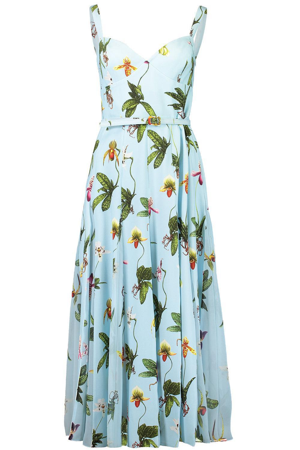 DETAILS AND INSIGHT Oscar De La Renta orchids day dress in light blue multi. 92%PL 8% EL; COMBO: 100%PL, LINING: 100% SILK Removable Belt DRY CLEAN Made in Italy Style 25RN236OCD-LBM