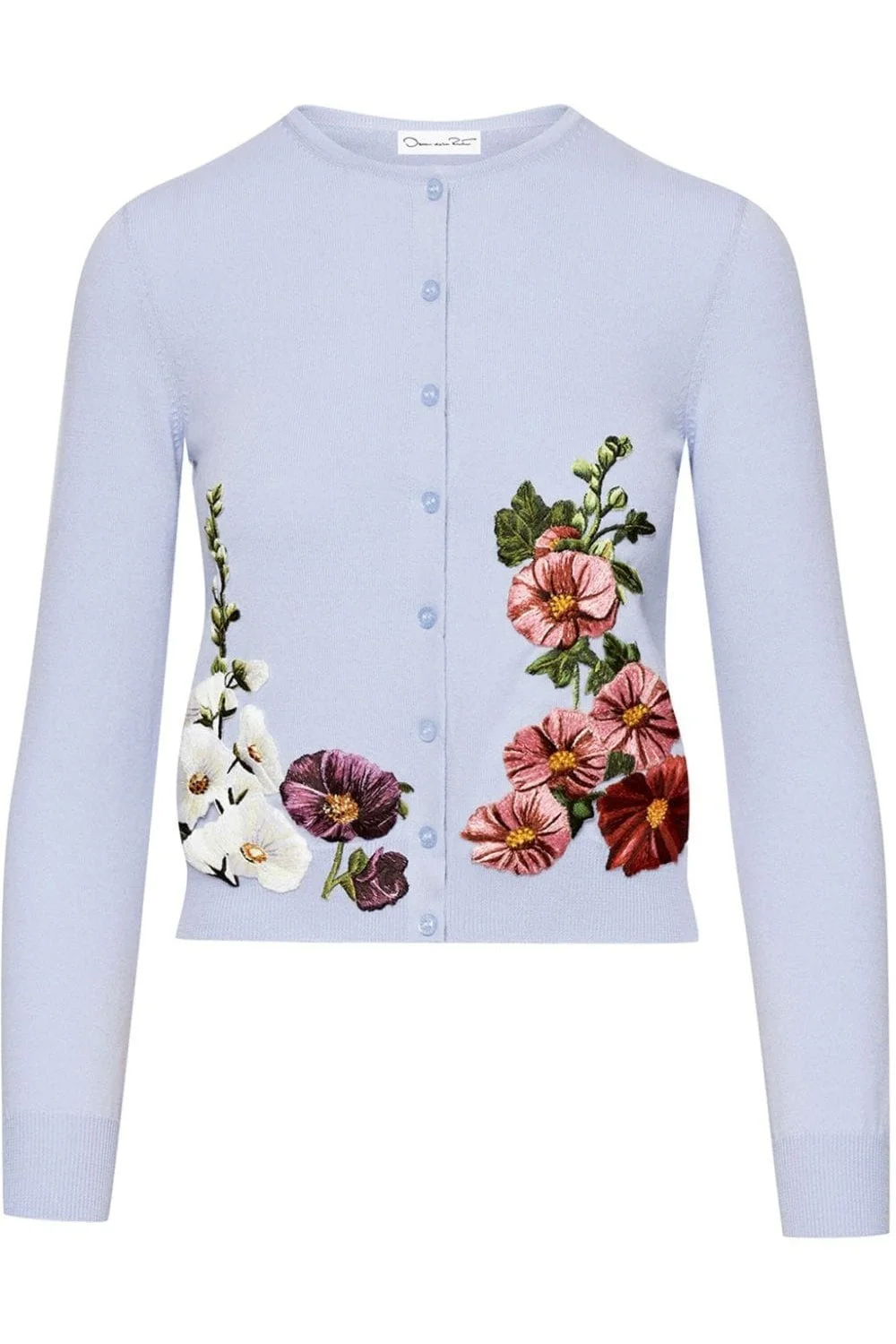 DETAILS AND INSIGHT Oscar De La Renta threadwork embroidered cardigan in pink pale blue. 100% WV DRY CLEAN Made in ITALY Style 24RE145HHK-PPB