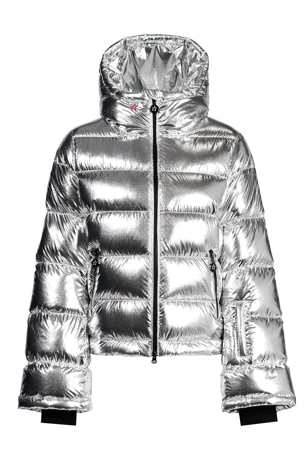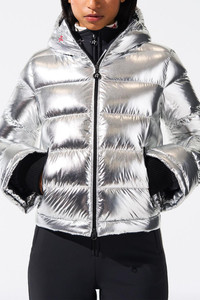 DETAILS AND INSIGHT Perfect Moment polar flare ski jacket ii in silver foil. Shell : 100% nylon Lining : 100% nylon Insulation : 90% goose down 10% feather Machine wash at 30'c Do not bleach Line dry Cool Iron Do not tumble dry Gentle dry cleaning Made in China Style W3001158-1757