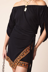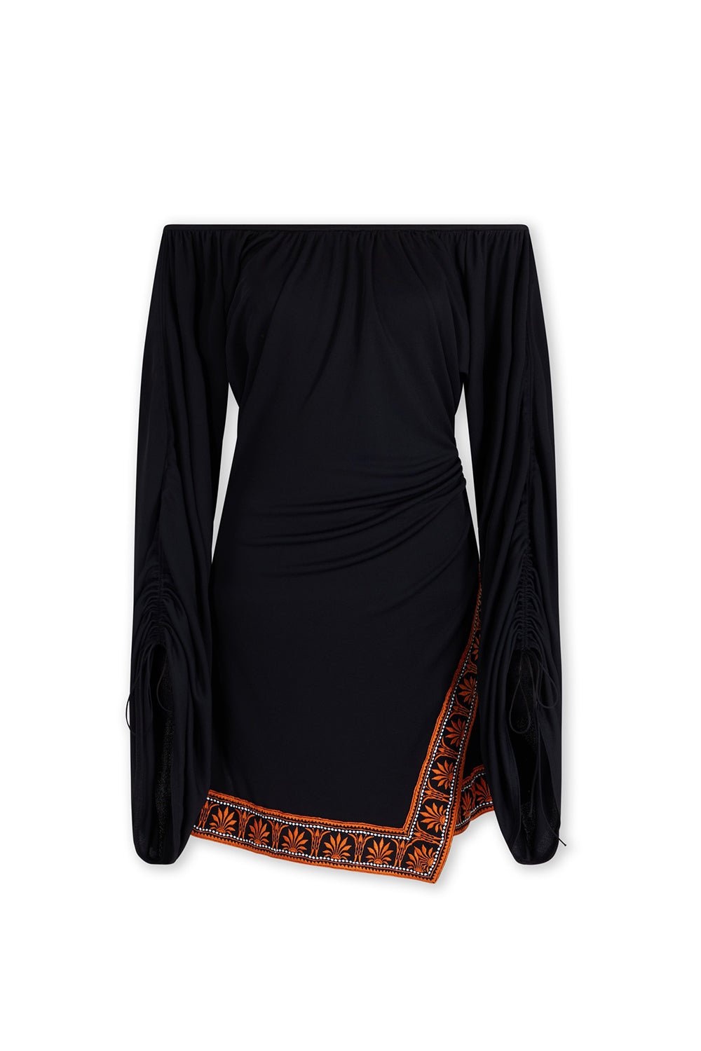 DETAILS AND INSIGHT Rabanne drape mini dress in black. 82%VISCOSE 18%POLYAMIDE Dry Clean Made in TUNISIE Style 24FJRO799VI0367-P001