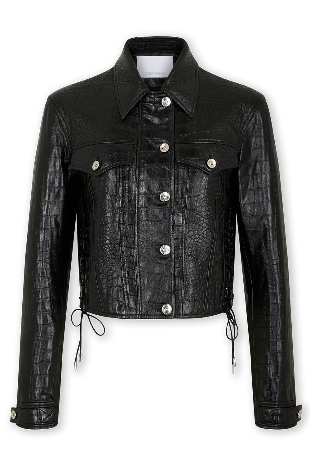DETAILS AND INSIGHT Rabanne embossed crop jacket in black. 100% Ovis aries Specialist Clean Made in France Style 24AFVE173MU0003-P001
