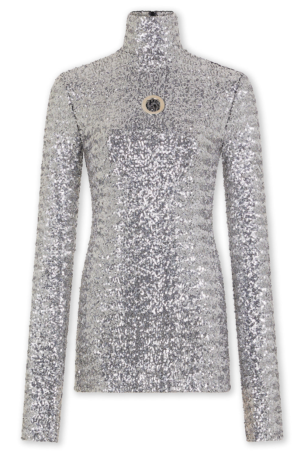 DETAILS AND INSIGHT Rabanne sequin stretch turtle-neck pullover in silver. 100% Polyester Dry Clean Made In Portugal Style 25HJTO201PO0356-P040