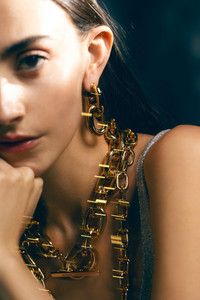 DETAILS AND INSIGHT Rabanne xl gold link hoop earrings in light gold. Gold-tone plated brass Measures approx 2" Made in Thailand Style 20PBB0024MET077