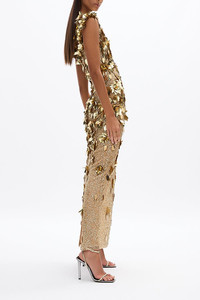 DETAILS AND INSIGHT Rachel Gilbert hugo gown in gold. 100% Nylon Tulle Dry Clean Only Imported Style 25RRG61994.GLD