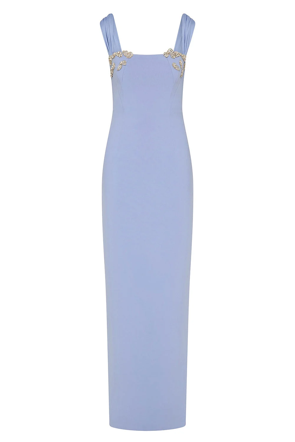 DETAILS AND INSIGHT Rachel Gilbert malia gown in blue. 95% Polyester 5% Spandex Dry Clean Only Made In Cn Style 26RRG62356.BLU