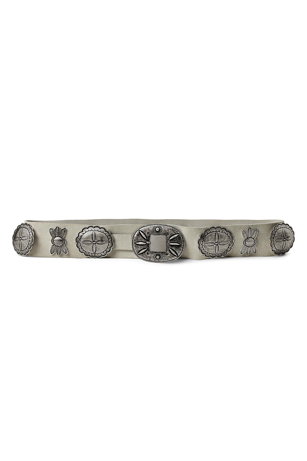 DETAILS AND INSIGHT Ralph Lauren suede cast concho belt in lux cream. This Hand-Finished Concho Belt Is Meticulously Rendered Using Traditional Wax Casting Techniques And A Bronze Base, Made In Partnership With New Mexico’S Shiprock Santa Fe Gallery And Renowned Navajo Silversmith Jimmy Begay Jr. The Design—Reminiscent Of Navajo Third Phase Concho Belts—Features Cast White Bronze Pieces With Repousse And Traditional Stamped Designs, Alternating Between Butterflies And Oval Conchos, And A Single-Prong Oval-Shaped Buckle. White Bronze Slides Set The Conchos On A Full-Grain Suede Belt. 100% Cow Leather XXS=25" L, XS=27" L, S=29" L, M=31" L, L=33" L, XL=35" L, XXL=37" L Made In Usa Style 408978246002_251-2X55