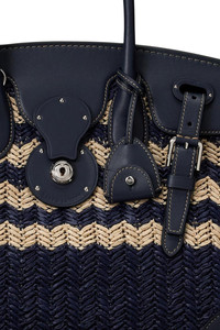 DETAILS AND INSIGHT Ralph Lauren soft ricky 33 raffia bag in navy/natural. The Soft Ricky 33 Offers A Less Structured, Lighter-Weight Take On The Iconic Ricky Bag, With The Same Commitment To Craftsmanship. Meticulously Made In Italy, This Version Is Crafted With A Braided Raffia-Like Body In A Chevron Motif, Lined With Cotton Canvas, Trimmed With Supple Calfskin, Detailed With Polished Hardware, And Finished With Our Signature Lock Debossed With “Ralph Lauren.” Shell: Viscose, Polypropylene, Polyester; Trim: Calfskin; Lining: Cotton; Pocket Lining: Lambskin 10.5" H X 12.25" L X 6.75" D. Made In Italy Style 435977801001_251-2XG2