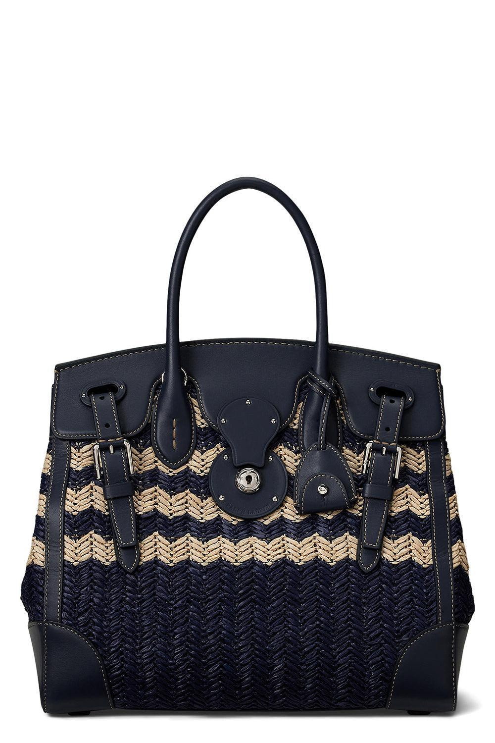 DETAILS AND INSIGHT Ralph Lauren soft ricky 33 raffia bag in navy/natural. The Soft Ricky 33 Offers A Less Structured, Lighter-Weight Take On The Iconic Ricky Bag, With The Same Commitment To Craftsmanship. Meticulously Made In Italy, This Version Is Crafted With A Braided Raffia-Like Body In A Chevron Motif, Lined With Cotton Canvas, Trimmed With Supple Calfskin, Detailed With Polished Hardware, And Finished With Our Signature Lock Debossed With “Ralph Lauren.” Shell: Viscose, Polypropylene, Polyester; Trim: Calfskin; Lining: Cotton; Pocket Lining: Lambskin 10.5" H X 12.25" L X 6.75" D. Made In Italy Style 435977801001_251-2XG2