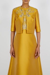 DETAILS AND INSIGHT Reem Acra embellished jacket in merigold. Light Mikado Pique Dry Clean Made in NYC Pre-Order Ships by Jan 7 Style 594-500-MERIGOLD