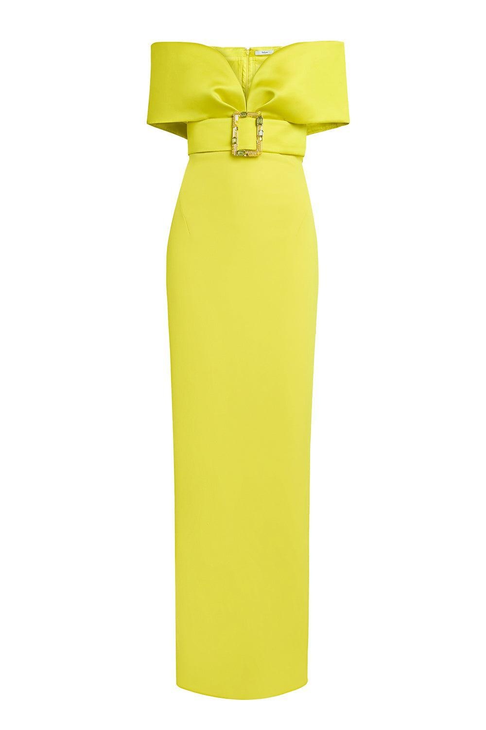 DETAILS AND INSIGHT Safiyaa abike gown in chartreuse. 92% Polyester, 8% Elastane, 57% Acetate, 35% Polyester, 8% Polyamide; Lining: 97% Polyester, 3% Lycra. Trim: 40% Glass, 40% Brass, 20% Acrylic. Dry Clean Made in Lithuania Style DL1145.1E186-CHARTREUSE