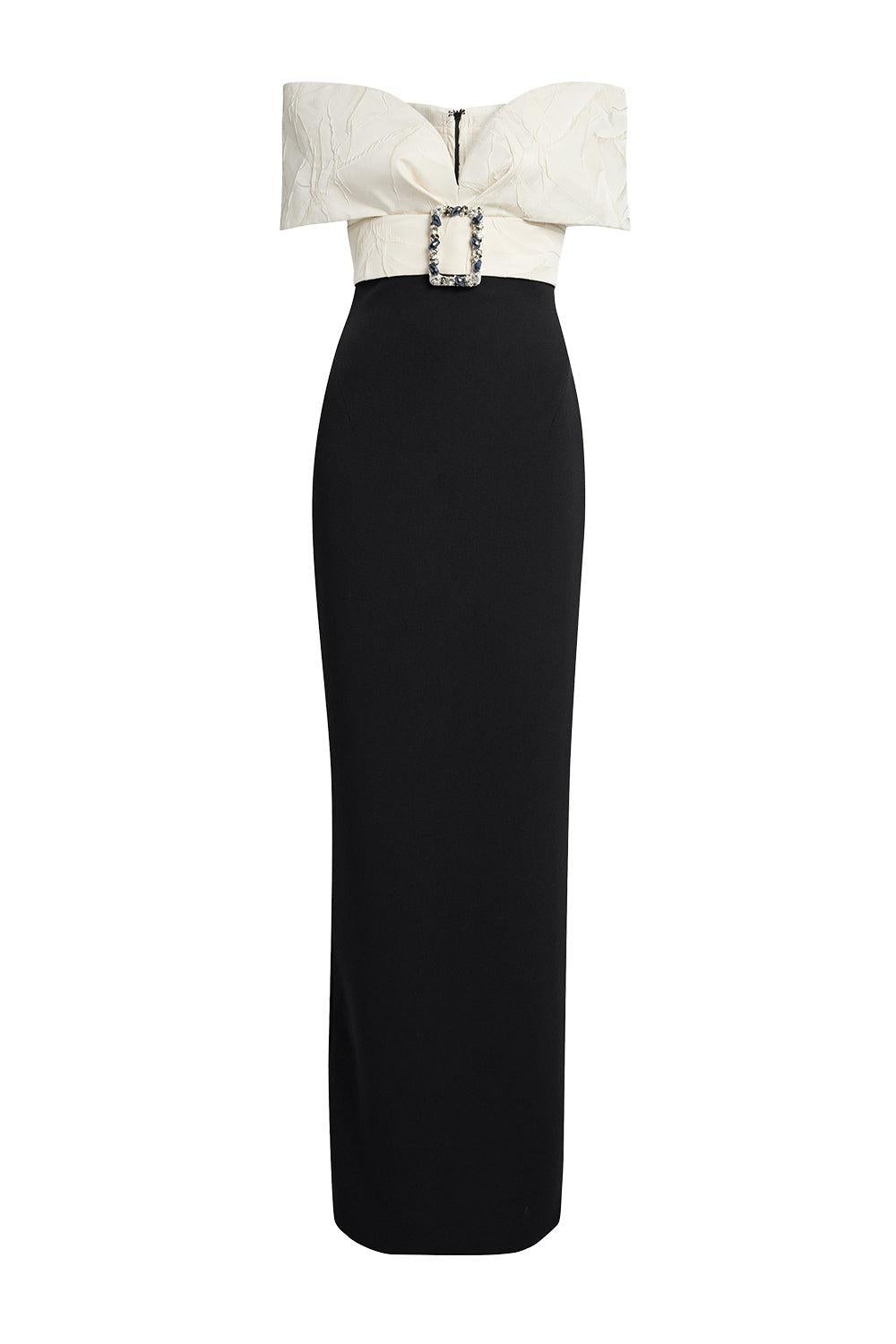 DETAILS AND INSIGHT Safiyaa abike gown in ivory/black/gunmetal. 92% Polyester, 8% Elastane, 57% Acetate, 35% Polyester, 8% Polyamide; Lining: 97% Polyester, 3% Lycra. Trim: 40% Glass, 40% Brass, 20% Acrylic. Dry Clean Made in Lithuania Style DL1145.2E185-IV/BLK/GUNM