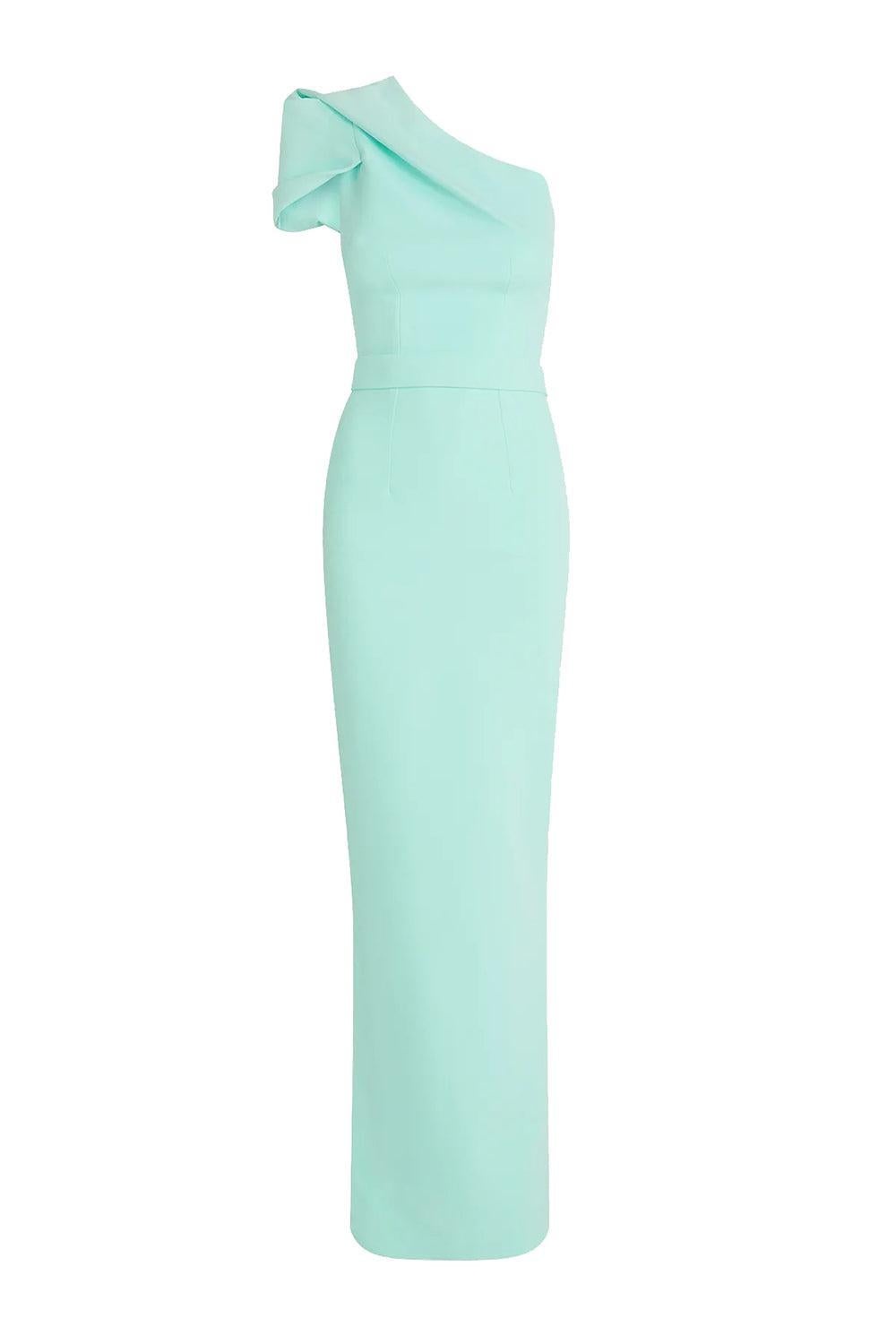 DETAILS AND INSIGHT Safiyaa kora gown in mint. 92% Polyester, 8% Elastane; Lining: 97% Polyester, 3% Lycra Dry Clean Made in Turkey Style DL345.1+BE32.1-MINT
