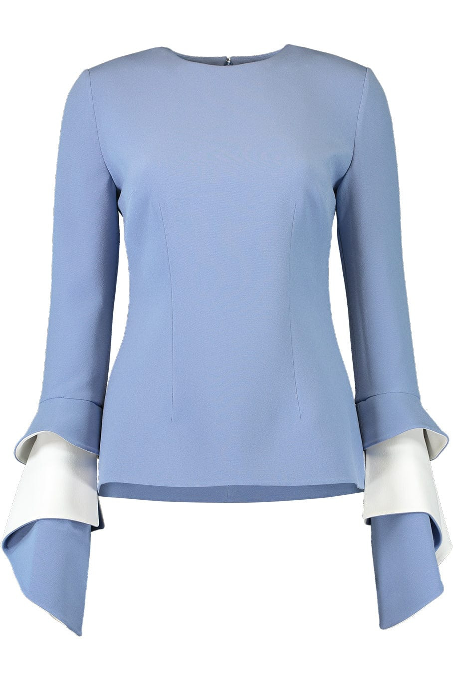 DETAILS AND INSIGHT Safiyaa meili top in blue ash ivory. 92% Polyester, 8% Elastane Dry Clean Only Made in Turkey Style T183.1-BLUASHIVORY