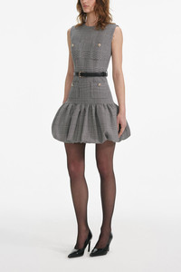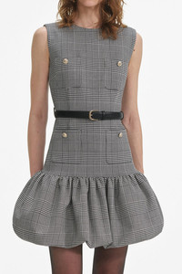 DETAILS AND INSIGHT Self-Portrait prince of wales dress in check. 66% Polyester 31% Viscose 3% Elastane Removable Belt Dry Clean Imported Ships by June 7 Style PF25-017SA-BW