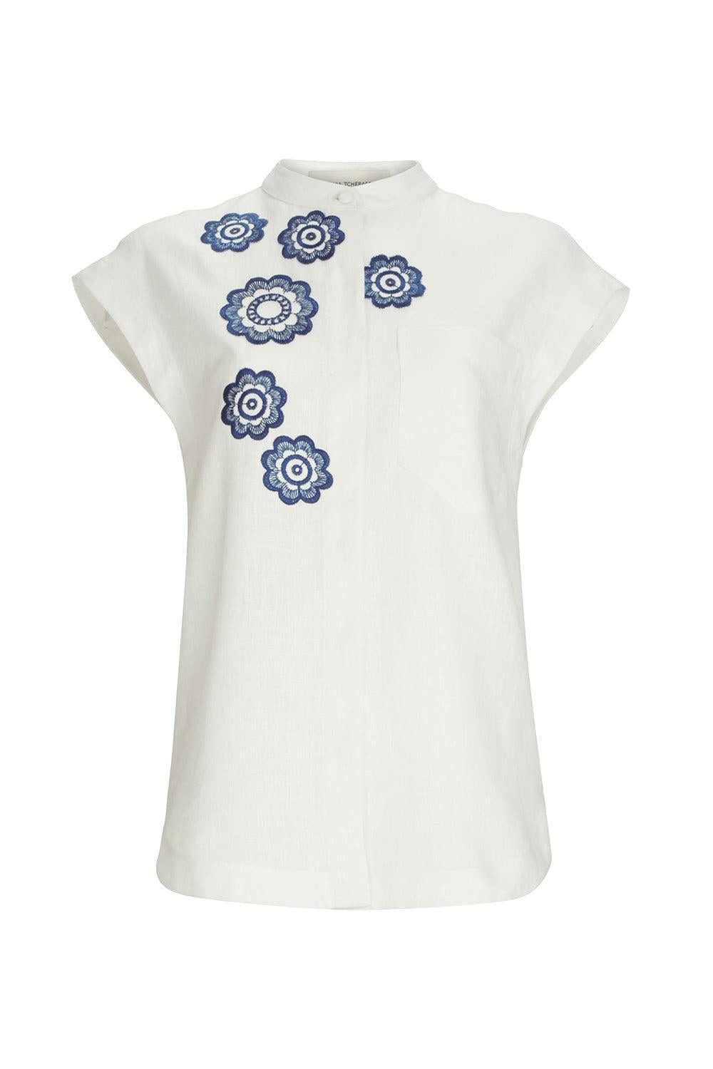 DETAILS AND INSIGHT Silvia Tcherassi adele blouse in white navy embroidery. 90% Linen 8% Cotton 2% Polyester Dry Clean Made In Colombia Style ST250437-0453