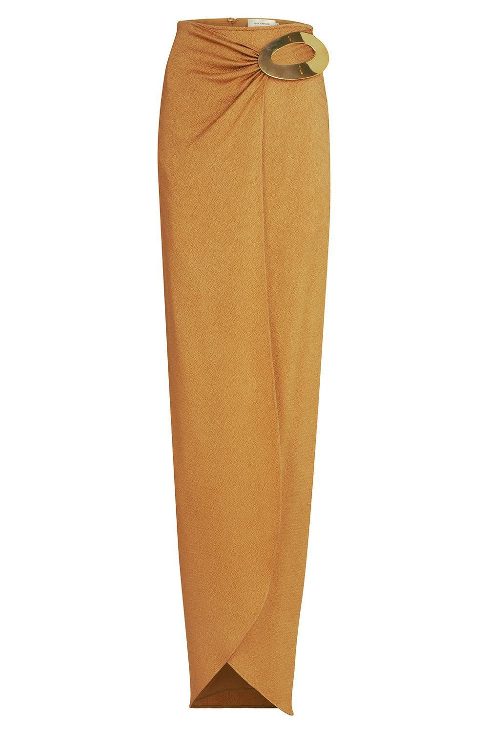 DETAILS AND INSIGHT Silvia Tcherassi gadea skirt in ochre. 51% Viscose 49% Acetate, Lining: 100% Polyester Dry Clean Made In Colombia Style ST250468-1241