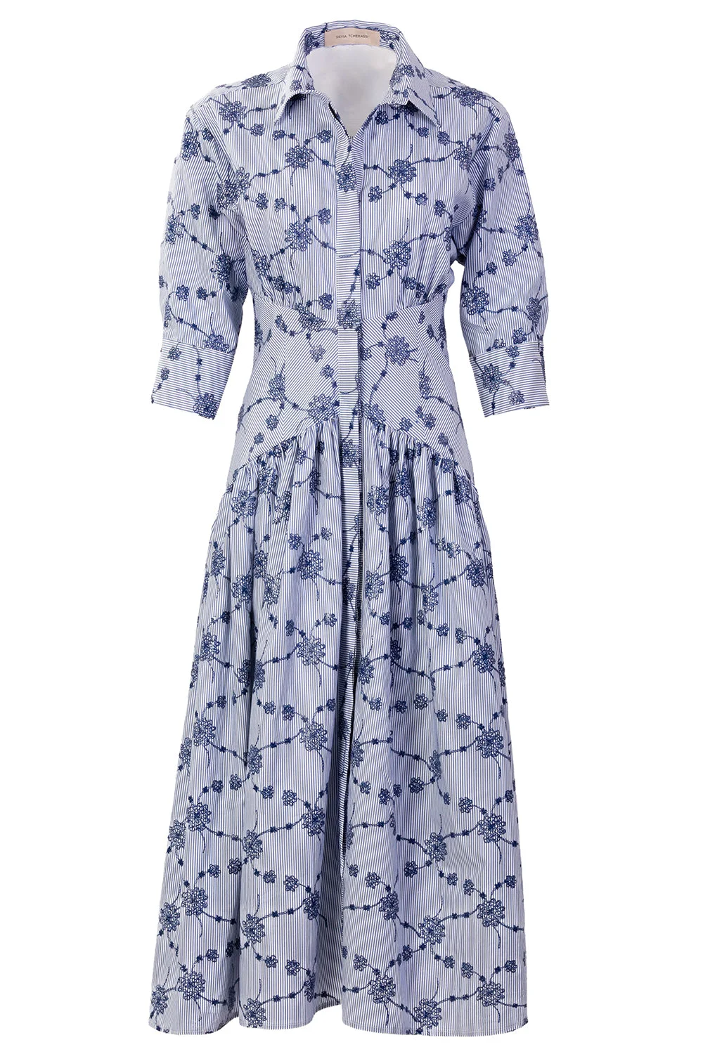 DETAILS AND INSIGHT Silvia Tcherassi indy dress in embroidered mini flowers. 65% Cotton 21% Thermoplastic Polyurethane 14% Polyester Dry Clean Made In Colombia Ships by Dec 27 Style ST260038-BLUE