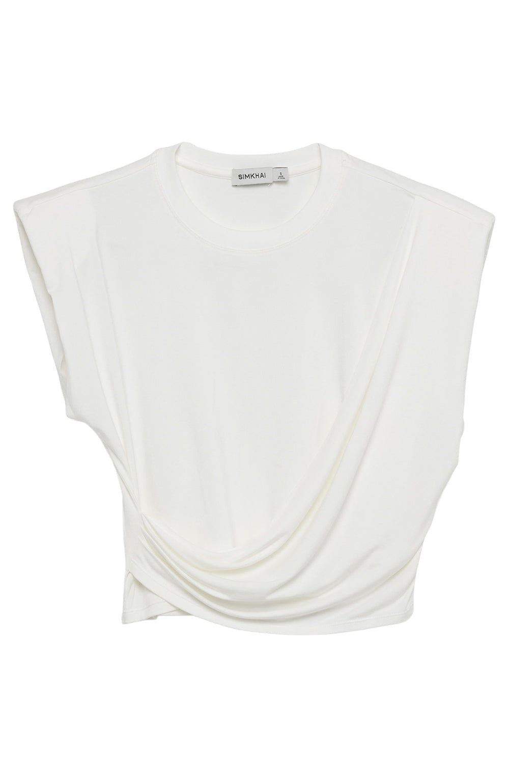 DETAILS AND INSIGHT Simkhai estelle wrap crop tee in white. 9% Viscose, 8% Spandex Dry Clean Only Made In Usa Style SI-2021-J-WHT