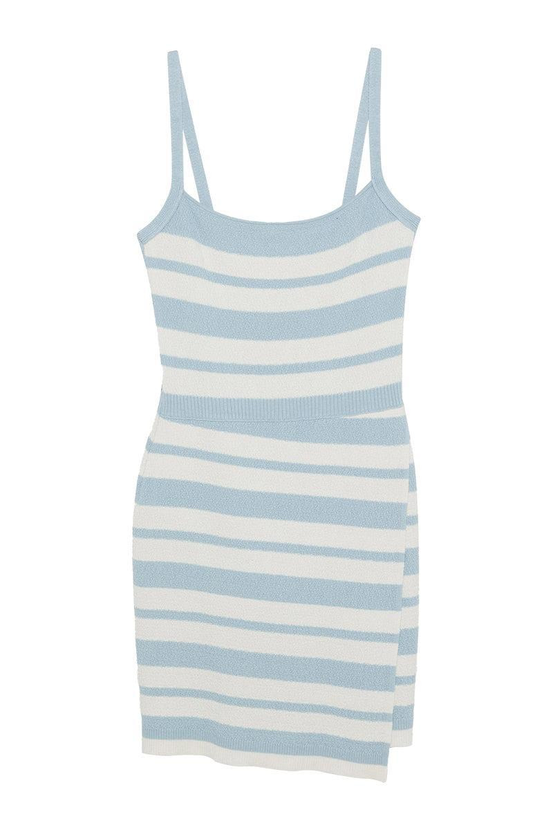 DETAILS AND INSIGHT Simkhai suvi dress in azure sky stripe. 70% Cotton, 30% Silk Dry Clean Made In Imported Style 325-1046-K-AZURE SKY STRIPE