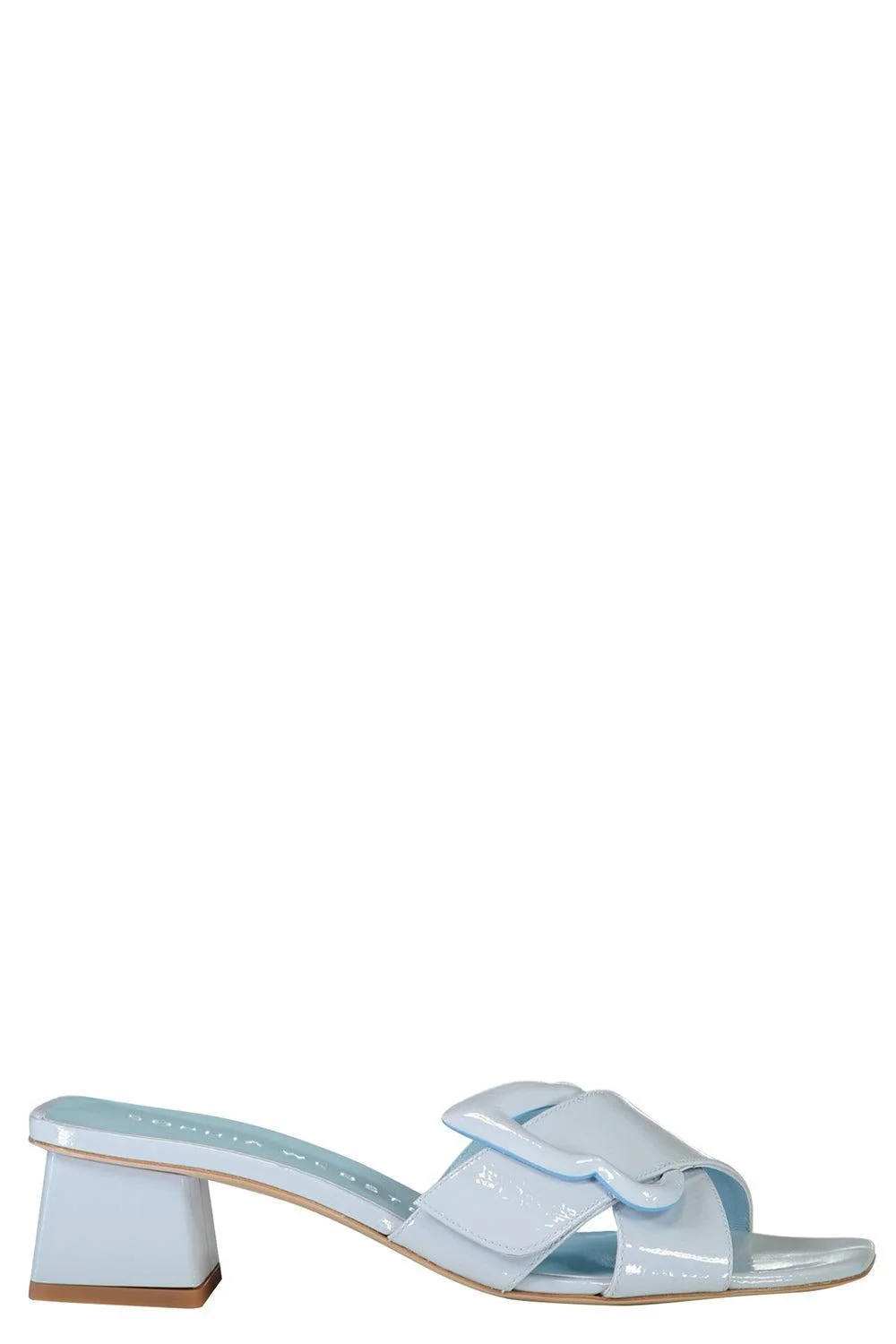 DETAILS AND INSIGHT Sophia Webster blair low mule in frozen blue. 100% Patent Leather Heel Height: 50mm Made in Spain Style SSS25042-FROZEN BLUE