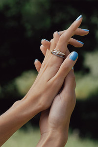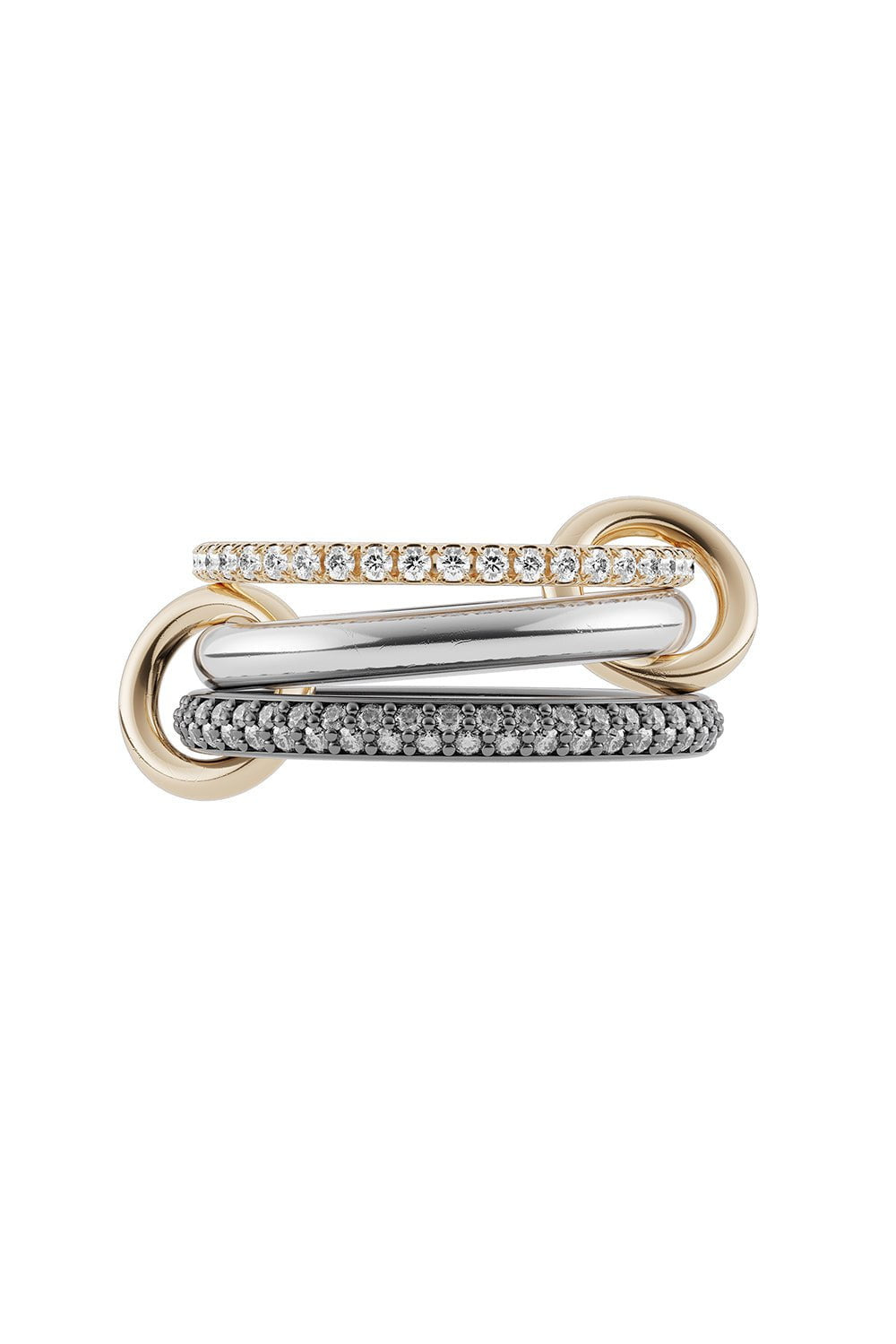 DETAILS AND INSIGHT Spinelli Kilcollin scorpio sg gris three link ring in yellow gold. 18k yellow gold, .925 sterling silver, black rhodium u-pavé white diamonds, micropavé grey (approx. 1.90 cttw) Style G3-SCOSGGR