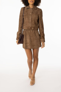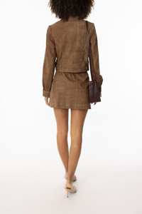 DETAILS AND INSIGHT SPRWMN pull on mini skirt in sepia. Suede Leather Specialist Clean Only Made in LA Style SKT035S-SEPA