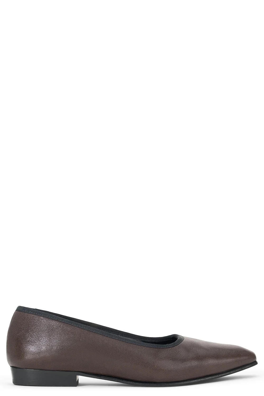DETAILS AND INSIGHT Staud keith flat in espresso. Upper: 100% Sheep Leather, Trim: 100% Polyester, Sole: 75% Cow leather, 25% Rubber Imported Style F25R3001BF-ESPR