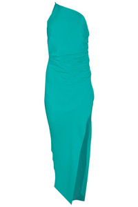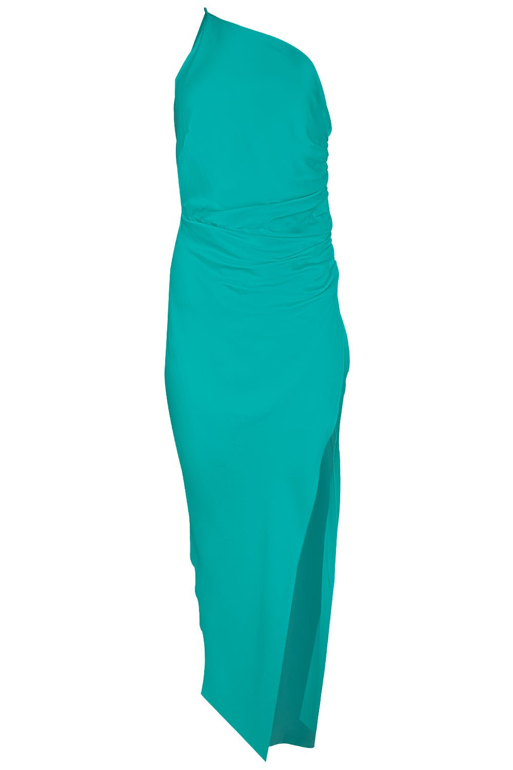 DETAILS AND INSIGHT The Sei asymmetric gathered wrap dress in turquoise. 100% SILK DRY CLEANING ONLY Made in China Style TS9139-TURQUOISE