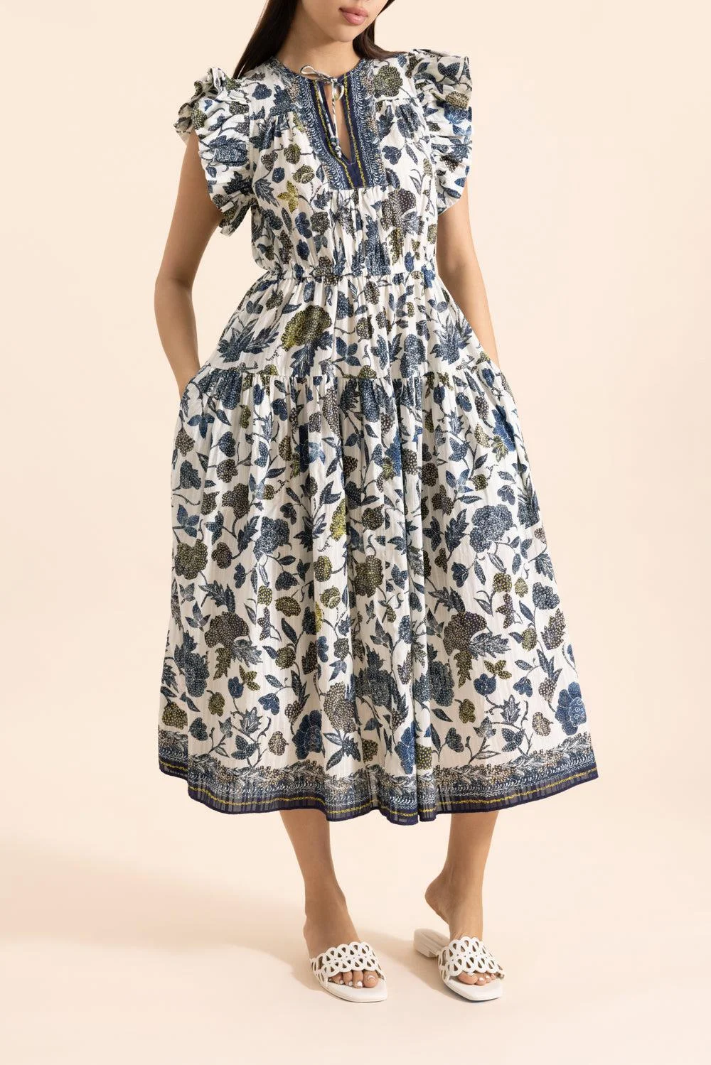 DETAILS AND INSIGHT Ulla Johnson kairi flutter sleeve midi dress in porcelain. 66% Cotton 34% Viscose Gentle Warm Machine Wash Made In India Style PS260167-PRC