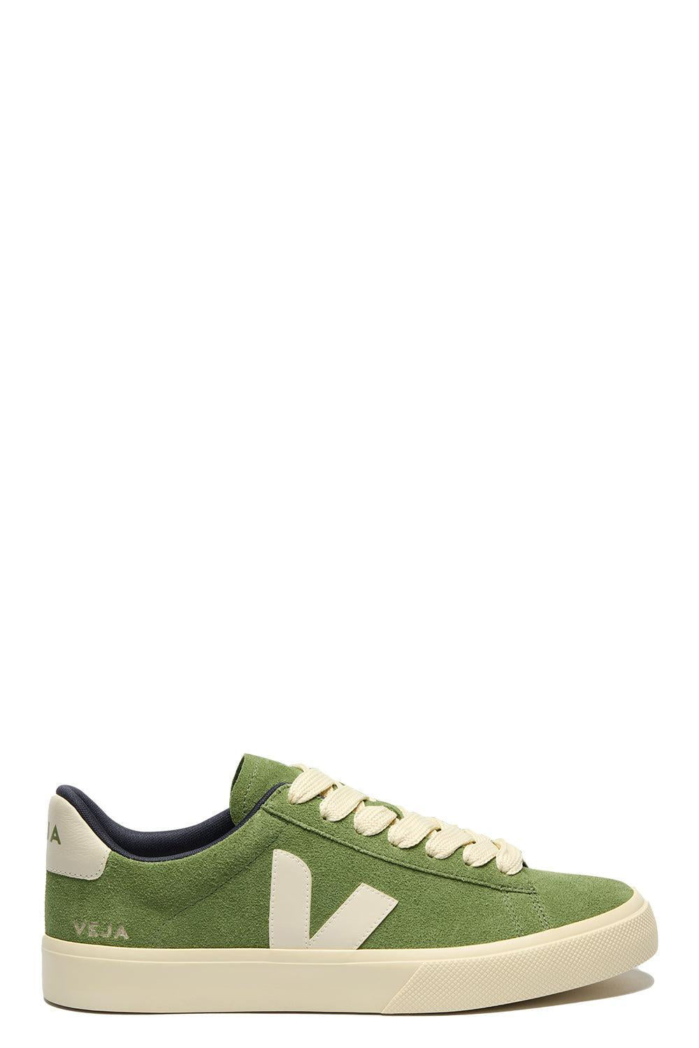 DETAILS AND INSIGHT Veja campo sneaker in kiwi pierre. Upper: Suede Panels: Suede Logo V: Amazonian rubber (26%), mineral silica (22%), synthetic rubber (21%) and others (31%) Insole: Amazonian rubber (11%), bio-based E.V.A.* (52%, including 42% sugarcane), recycled E.V.A.* (11%), organic cotton (12%) and others (14%) Outsole: Amazonian rubber (40%), mineral silica (23%), recycled rubber (10%), synthetic rubber (11%) and others (16%) Welt: Synthetic rubber (40%), mineral silica (22%) and others (38%) Lining: Recycled polyester (100%) Laces: Recycled polyester (100%) Made in Brazil Style CP0320525-KIWI/PIERRE