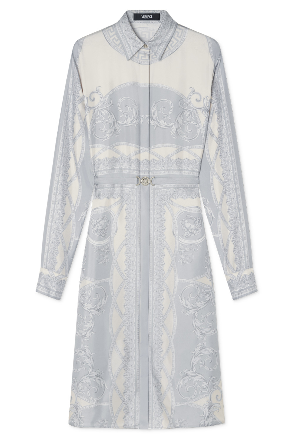 DETAILS AND INSIGHT Versace la coupe des dieux shirt dress in grey/champagne. 100% Silk Trim: 100% Silk Dry Clean Made in Italy Style 1018622_1A13359-5E450