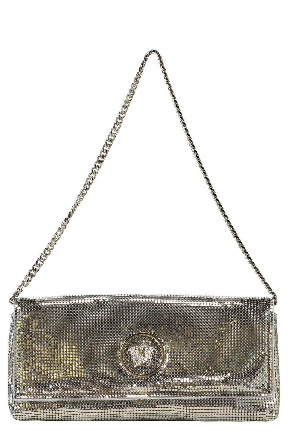 DETAILS AND INSIGHT Versace la medusa clutch in silver mesh. Outer composition: 50% Metal, 50% Glass; Lining: 100% Lambskin; Trim: 72% Viscose, 28% Silk Shoulder Strap Drop: 10.2" L L10.4 x W1.2 x H5.1" Fits Iphone 16 Pro Max Imported Style 1019867_1A15323-1E56V