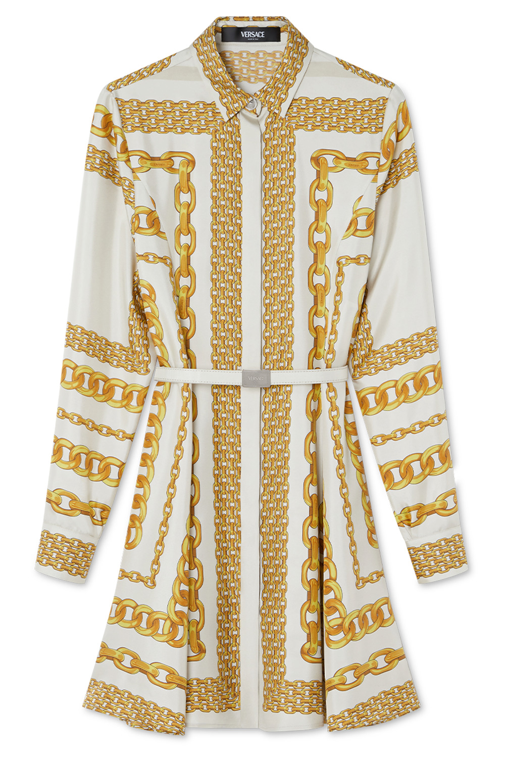 DETAILS AND INSIGHT Versace treasure midi shirt dress in bone/gold. 100% Silk; Trim: 100% Silk Removable Belt Dry Clean Imported Style 1018933_1A13638-5E490