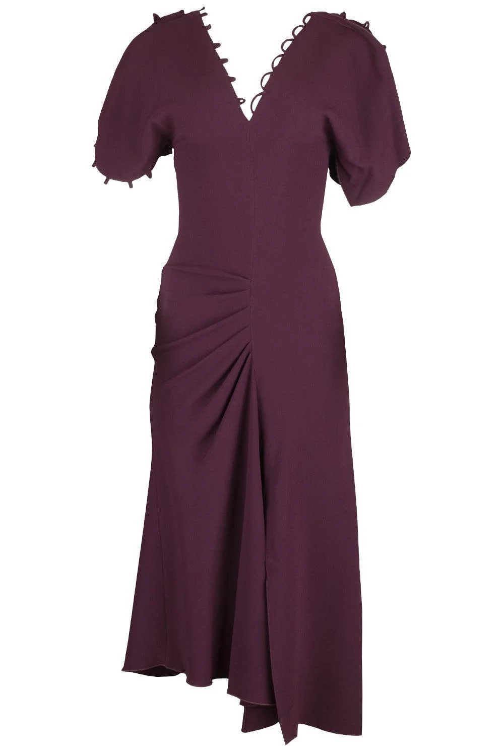 DETAILS AND INSIGHT Victoria Beckham rouleaux detail dress in merlot. 50% Viscose 47% Acetate 3% Elastane Dry Clean Made In Portugal Style 1425WDR007063B-2757