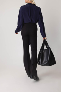 DETAILS AND INSIGHT Victoria Beckham v-neck scarf blouse in ink blue. 100% Silk Dry clean only Made in Portugal Style 1424WSH005866A-8342