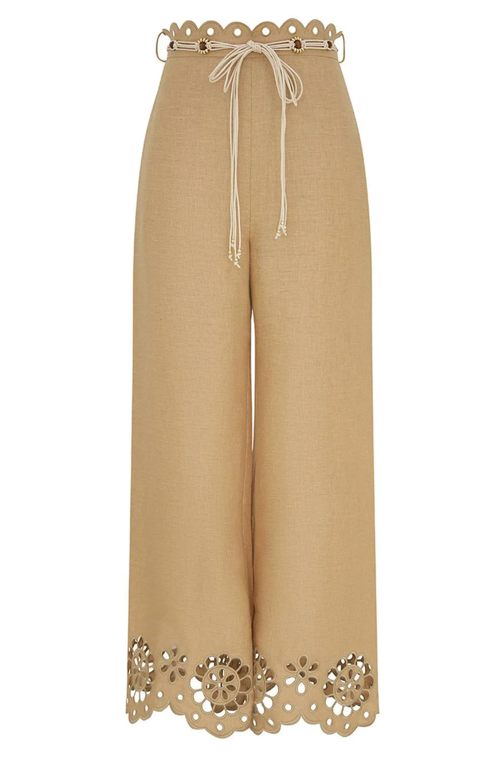 DETAILS AND INSIGHT Zimmermann awaken embroidered kick flare in straw. Main: 100% Linen; Embroidery: 100% Polyester; Pocketing: 100% Cotton Dry Clean Only Code F (Hydrocarbon Only) Remove Any Detachable Trims Prior To Dry Cleaning Cover To Protect Trim Iron In Low Temperature With Protective Cloth Light Steam Only Do Not Spot Clean Made In China Style 6071PRS261-STRAW