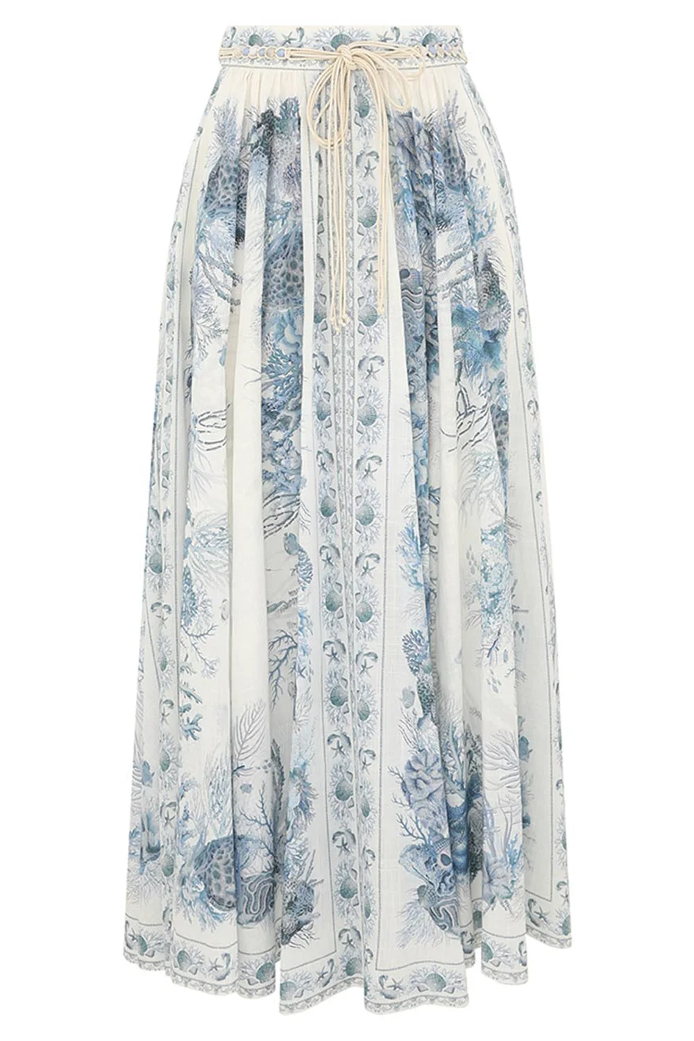 DETAILS AND INSIGHT Zimmermann wanderlust a-line maxi skirt in blue toile. Main: 100% Cotton; Lining: 100% Cotton Dry Clean Only Code F (Hydrocarbon Only) Remove Any Detachable Trims Prior To Dry Cleaning Cover To Protect Trim Iron In Low Temperature With Protective Cloth Light Steam Only Do Not Spot Clean Made In Portugal Style 5851SRS262-BLUE TOILE