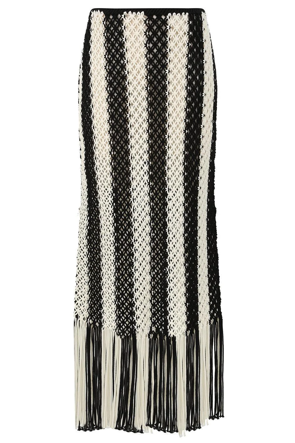 DETAILS AND INSIGHT Zimmermann wanderlust macrame maxi skirt in black/ivory. 100% Cotton; Slip: 86% Recycled Polyester, 14% Elastane Dry Clean Only Code F (Hydrocarbon Only) Remove Any Detachable Trims Prior To Dry Cleaning Cover To Protect Trim Iron In Low Temperature With Protective Cloth Do Not Spot Clean Store Garment Flat Do Not Hang Gentle Cold Hand Wash Separately With Mild Detergent Do Not Bleach Dry In Shade Iron In Low Temperature With Protective Cloth Do Not Tumble Dry Dry Cleanable Code F (Hydrocarbon Only) Made In China Style 6291SRS262-BLACK/IVORY