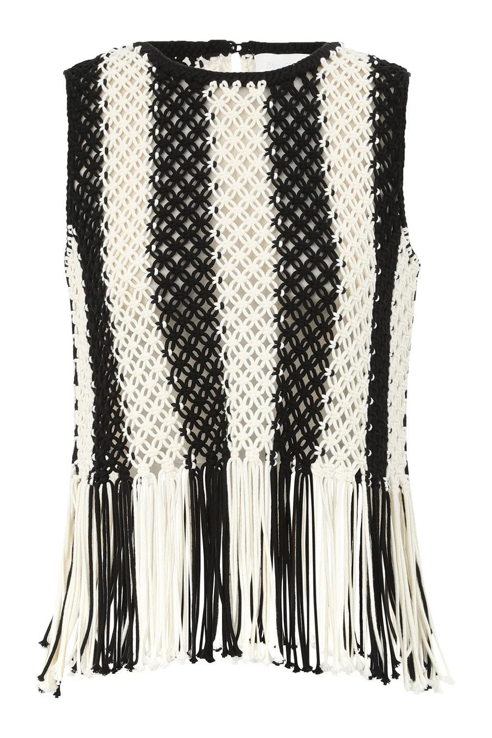 DETAILS AND INSIGHT Zimmermann wanderlust macrame tank in black/ivory. 100% Cotton Dry Clean Only Code F (Hydrocarbon Only) Remove Any Detachable Trims Prior To Dry Cleaning Cover To Protect Trim Iron In Low Temperature With Protective Cloth Do Not Spot Clean Store Garment Flat Do Not Hang Made In China Style 6290TRS262-BLACK/IVORY
