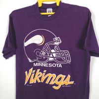 Vintage Minnesota Vikings T-Shirt NFLP | BS17810. Tag: Logo 7. Size on tag: Large. Manual Measurement (Laying Flat): Chest Armpit to Armpit: 20 Inch. Length: 29 Inch. (Please compare this measurement with your favorite shirt.) Made in USA. No Edge Bone, No Stain, No Hole. Fabric Material: Duo-Blend, 50% Polyester / 50% Cotton. Copyright 1990 by NFLP. In good Condition overall. BS17810. We do combine shipping. ======================================== We're using the registered air-mail with tracking number (2-4 weeks). For DHL Express packages, please add-on $20, only take 2-5 Day for arrived. TRACKING NUMBER WILL BE GIVEN AFTER POSTAGE. Looking for serious buyer only. Make our shop as favorite as lot of stuff is yet to come! Items are open for negotiation at a reasonable price. Feel free to browse through the listing and you might find some treasure for yourself OR perhaps for your friends and family too! Do follow us for more update and new uploads! Thanks for view and have a nice day.