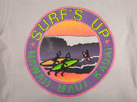 Vintage Surf's Up Hawaii Maui Kauai T-Shirt | BS1804. Tag: Fruit of the Loom Size on tag: Medium Manual Measurement (Laying Flat): Chest Armpit to Armpit: 18.5 Inch Length: 28 Inch. (Please compare this measurement with your favorite shirt.) Made in USA No Edge Bone, No Stain, No Hole Fabric Material: 100% Cotton We do combine shipping. ***Got some rust stain at some collar area, please refer the picture detail more carefully =) . BS1804. ======================================== We're using the registered air-mail with tracking number (2-4 weeks). For DHL Express packages, please add-on $20, only take 2-5 Day for arrived. TRACKING NUMBER WILL BE GIVEN AFTER POSTAGE. Looking for serious buyer only. Make our shop as favorite as lot of stuff is yet to come! Items are open for negotiation at a reasonable price. Feel free to browse through the listing and you might find some treasure for yourself OR perhaps for your friends and family too! Do follow us for more update and new uploads! Thanks for view and have a nice day.