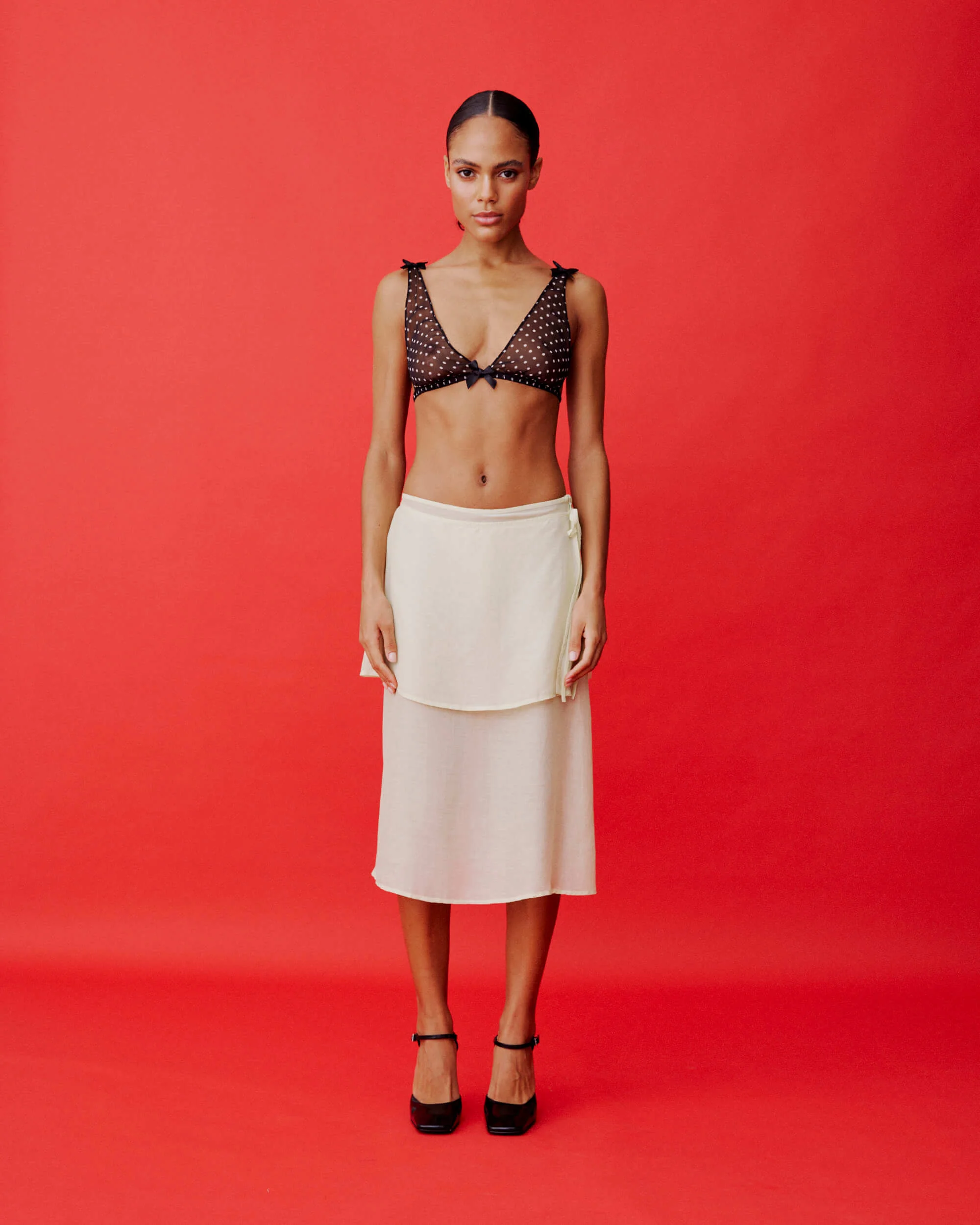 Shaping femininity through a playful overlaying of two skirts in soft viscose for a delicate semi-sheer effect — chicness revisited in the trendiest fashion. Details Fabric: 100% Viscose Color: Butter Cream Size and Fit Model wears a size xs Relaxed fit, sheer, mid waist, buy your size